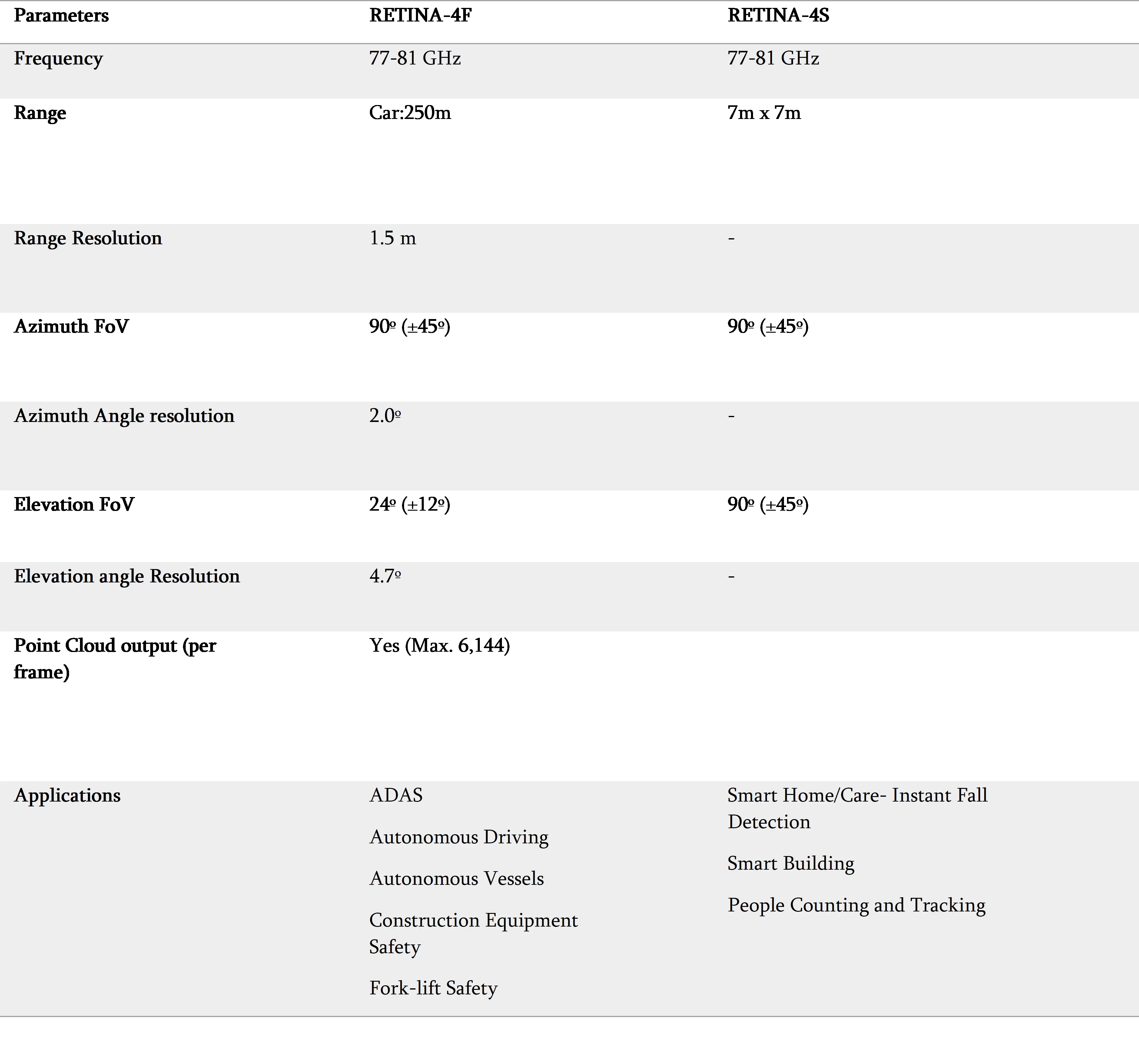 The RETINA 4D imaging radar products range from short-range to long-range designed for applications such as ADAS, autonomous vehicles, autonomous off-highway, equipment safety, smart city, and indoor monitoring. This includes RETINA-4F, RETINA-4SN, and RETINA-XF (X > 4) product segments.