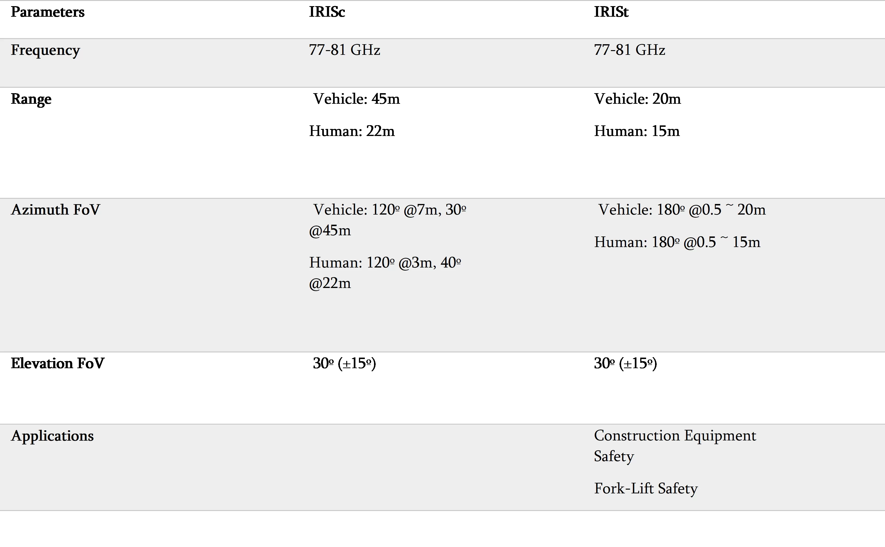 Both the single radar IRIS and 4D imaging radar RETINA offer high resolution, wider FoV, and a longer detection range. Below are the general product specifications for different product segments.